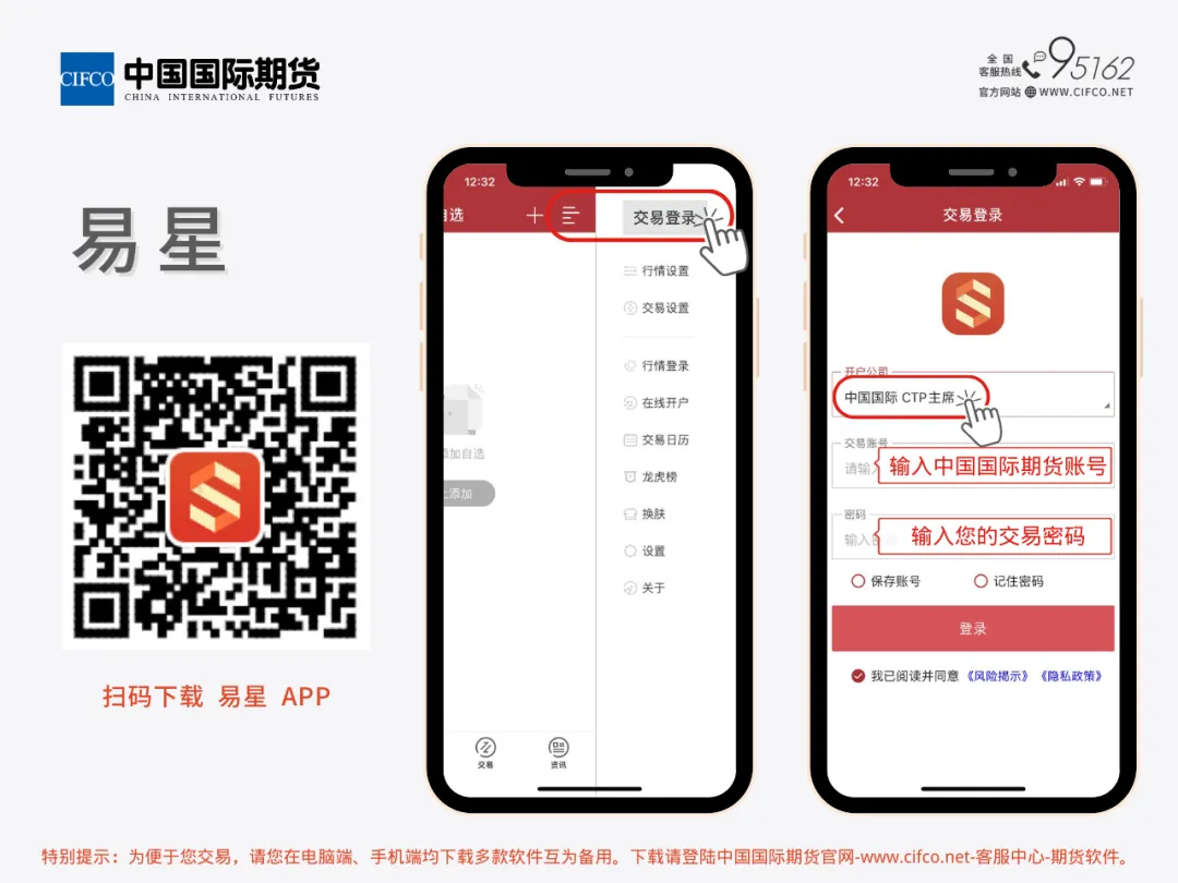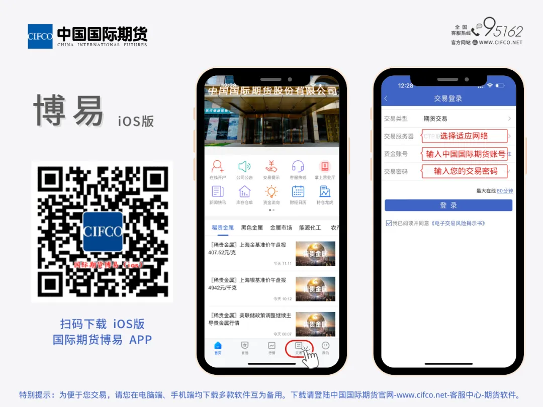 您好!请您在下载和使用交易软件之前,务必注意加强自身计算机安全防护,防止用于网上交易的计算机或手机终端感染木马、病毒,以免被恶意程序窃取口令;加强自身账号、口令的保护,不使用简单口令、定期修改口令、输入口令时防止他人偷看、不对他人泄露口令。同时仔细阅读下面的《软件下载免责声明》、《网上交易风险提示书》及《期货多功能网上交易系统使用风险揭示》提示。一经使用中国国际期货的网上交易软件,视为您已经认可下述声明和提示(请进入官网http://www.cifco.net/ 的“客服中心——软件下载”页面或点击“阅读原文”阅览):1.软件下载免责声明;2.网上交易风险揭示;3.期货多功能网上交易系统使用风险揭示。