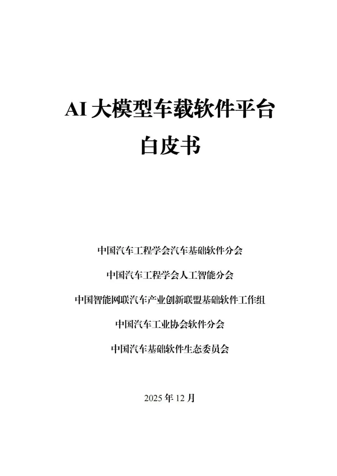 这份由中国汽车工程学会、中国汽车工业协会等权威机构联合发布的《AI大模型车载软件平台白皮书》,是2025年12月发布的重要行业指导文件。白皮书系统阐述了AI大模型技术在智能网联汽车领域的应用架构和技术路线,具有以下重要意义: