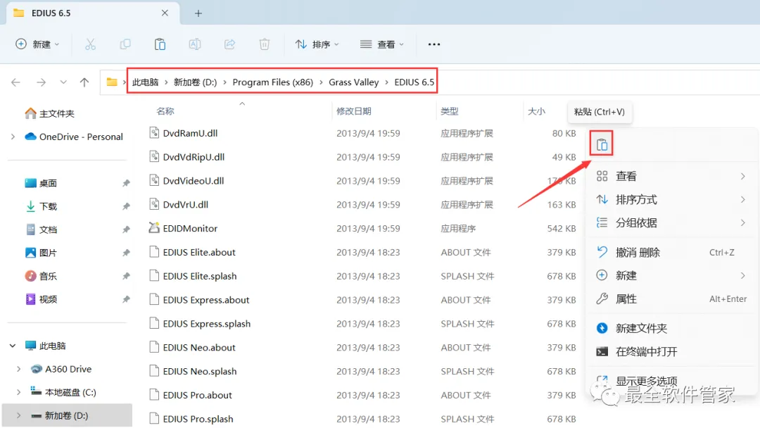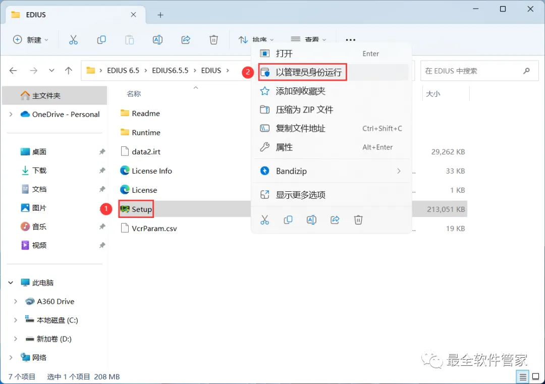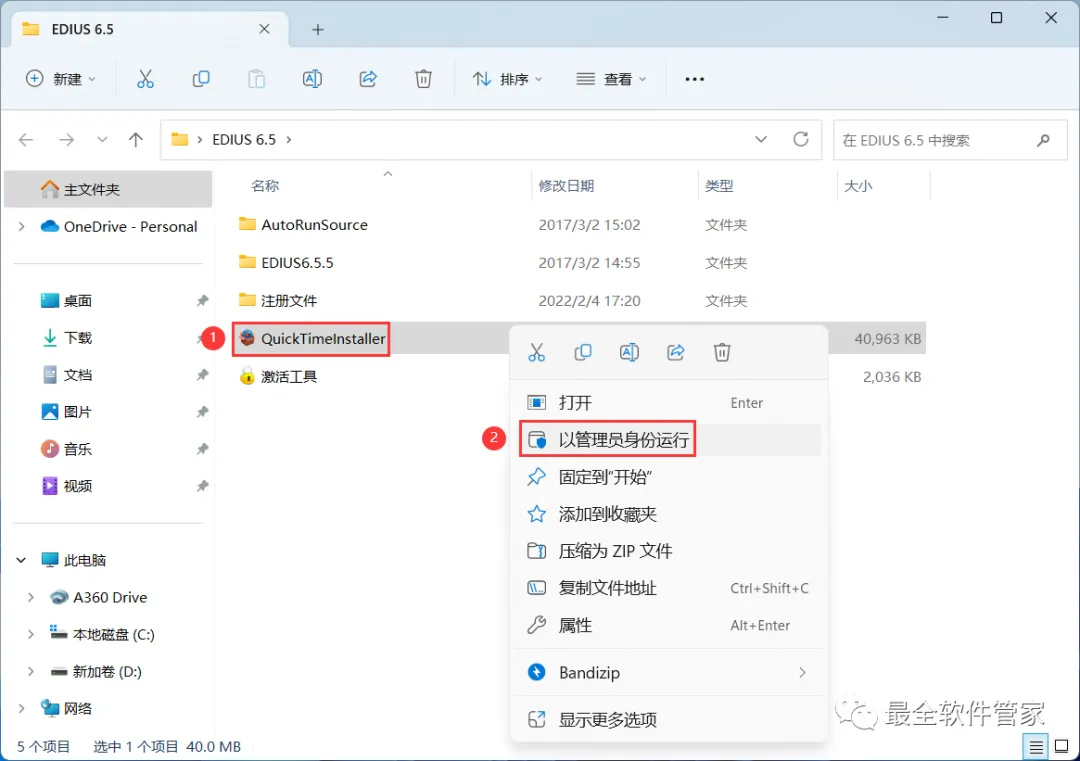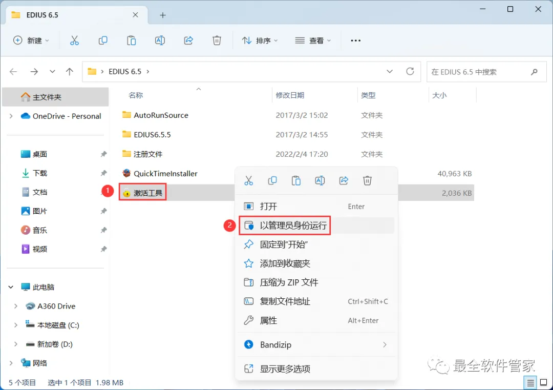 32、回到EDIUS 6.5文件夹,找到【激活工具】应用程序,右键选择【以管理员身份运行】它