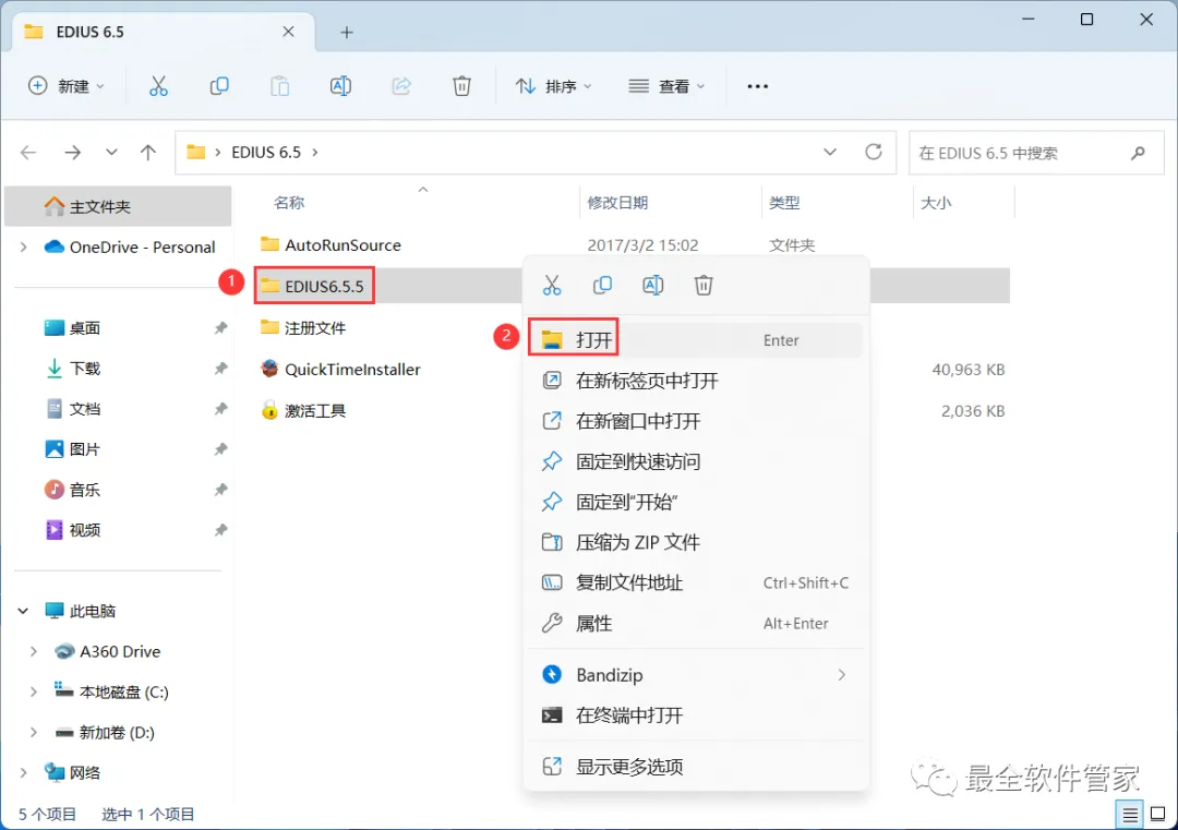 14、回到EDIUS 6.5文件夹,找到【EDIUS6.5.5】文件夹,右键【打开】它