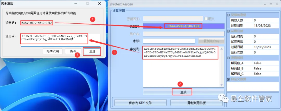 33、打开软件界面,将软件的【机器码】填入到程序的【机器码】内,再点击【生成】,将程序的【序列号】填入到软件的【注册码】内,再点击【注册】