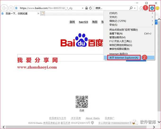 1.安装前注意一下自己电脑的IE浏览器是不是10 版本及以上的,如果不是需要先升级到10才能安装 Visual Studio2015。打开IE浏览器,点击【设置】接着点击【关于Internet Explorer】