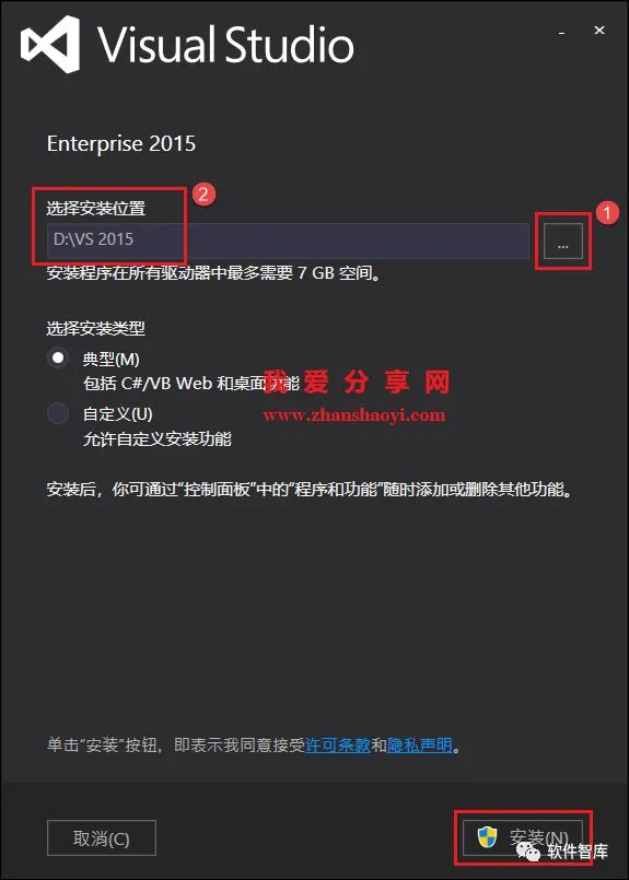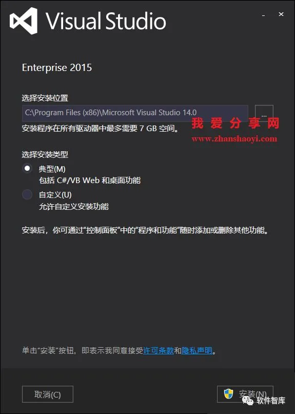4.VS 2015软件后会安装很多插件内容且需要7G+磁盘空间,请用户谨慎安装。
