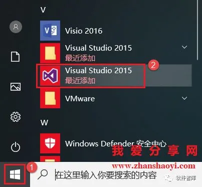 20.关闭并重启软件,点击左下角的开始按钮,在菜单栏中找到并单击打开【VisualStudio2015】