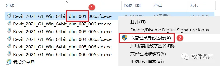 2.然后在文件夹内找到Revit_2021_G1_Win_64bit_dlm_001_006.sfx.exe,鼠标右击选择【以管理员身份运行】