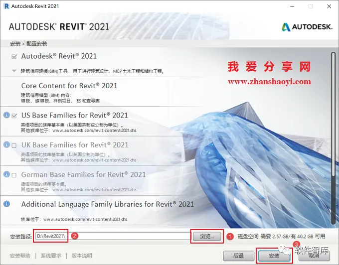 7.选择软件安装路径,默认安装在C盘,点击【浏览】可更改软件安装路径,注意:安装路径文件夹名称不能出现中文字符!小编这里将软件安装在D盘Revit2021文件夹下(需提前在D盘新建名为Revit2021的文件夹),然后点击【安装】