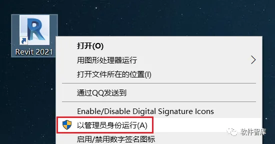 14.返回电脑桌面,找到Revit2021图标,鼠标右击选择【以管理员身份运行】