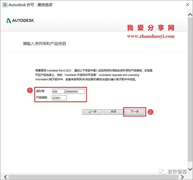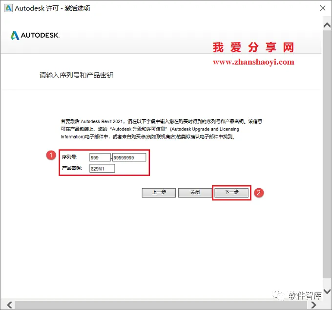 22.输入序列号:999-99999999,产品密钥:829M1,然后点击【下一步】