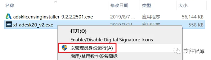 24.再次打开“注册机”文件夹,找到xf-adsk20_v2.exe,鼠标右击选择【以管理员身份运行】,注意:一定要“以管理员身份运行”注册机,不然会激活失败
