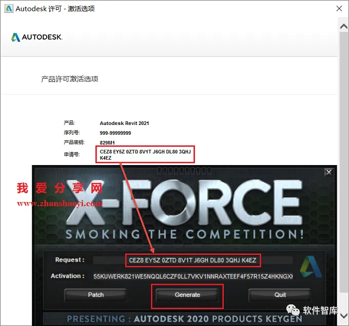 26.先将安装界面中的“申请号”复制粘贴到注册机界面中“Request”栏后面的框中,然后点击【Generate】生成激活码,注意:复制粘贴只能使用快捷键Crtl+C、Crtl+V
