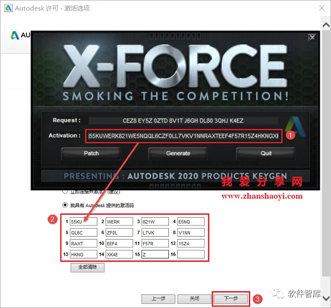 27.再将注册机界面中“Activation”栏后面框中生成的字母串全部复制粘贴到安装界面中的第一个小框中即可自动填充,然后点击【下一步】,注意:复制粘贴只能使用快捷键Crtl+C、Crtl+V