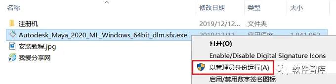 1.先使用“百度网盘客户端”下载Maya_2020软件安装包(含注册机)到电脑磁盘里,并解压缩,安装前先断开电脑网络,然后找到Autodesk_Maya_2020_ML_Windows_64bit_dlm.sfx.exe,鼠标右击选择【以管理员身份运行】