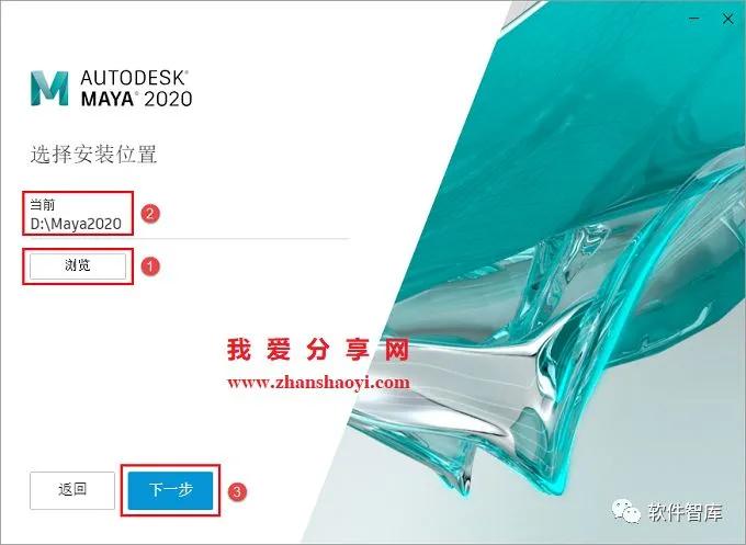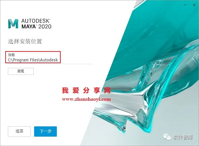 5.选择软件安装路径,默认安装在C盘,点击【浏览】可更改软件安装路径,注意:安装路径文件夹名称不能出现中文字符!小编这里将软件安装在D盘Maya2020文件夹下(需提前在D盘新建名为Maya2020文件夹),然后点击【下一步】