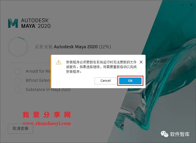 7.正在安装,安装到12%左右可能会弹出如下窗口提示需要重启,点击【Ok】