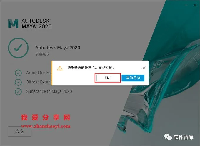 9.提示需要重启计算机以完成安装,点击【稍后】暂不重启