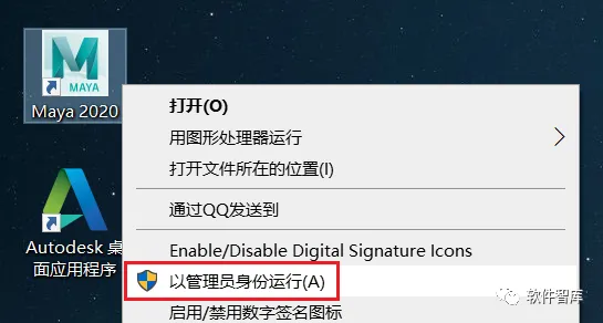 11.返回电脑桌面,找到Maya2020图标,鼠标右击选择【以管理员身份运行】