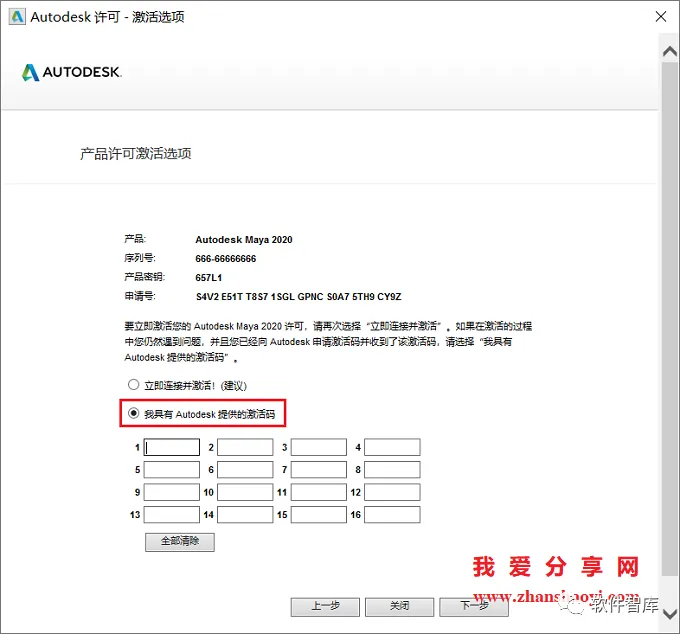 19.先勾选“我具有Autodesk提供的激活码”,不要着急点击“下一步”,下面我们通过“注册机”来生成激活码