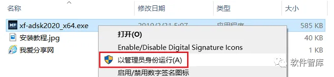 21.然后找到xf-adsk2020_x64.exe,鼠标右击选择【以管理员身份运行】,注意:一定要“以管理员身份运行”注册机,不然会激活失败