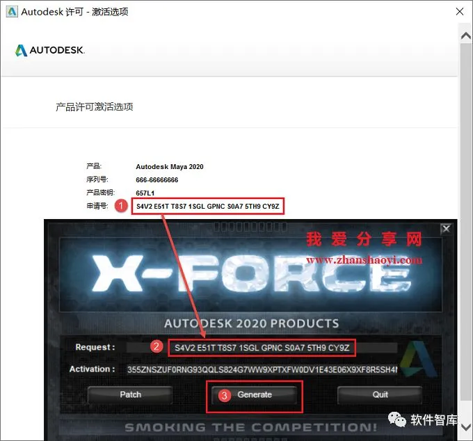 23.先将安装界面中的“申请号”复制粘贴到注册机界面中“Request”栏后面的框中,然后点击【Generate】生成激活码,注意:复制粘贴只能使用快捷键Crtl+C、Crtl+V