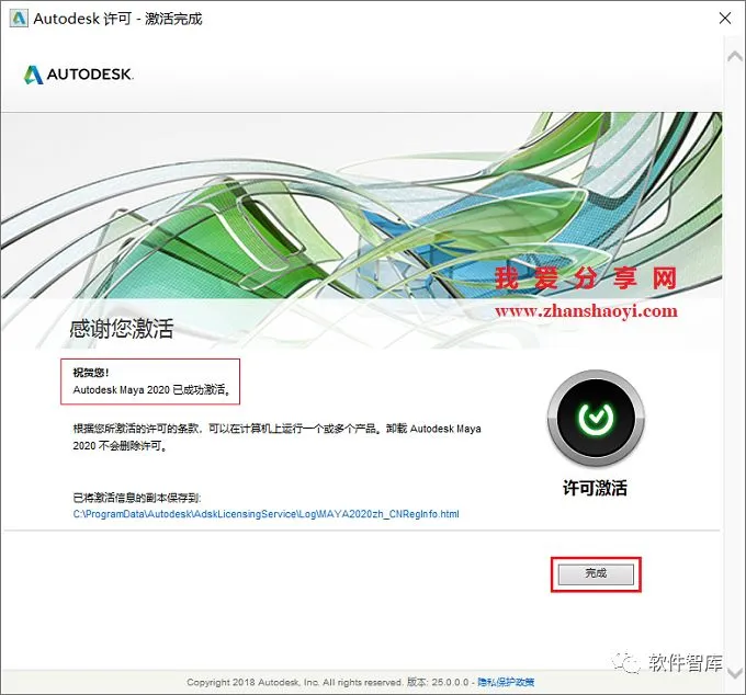 25.提示Maya2020激活成功,然后点击【Quit】按钮关闭注册机,再点击【完成】