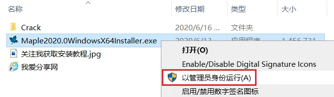 1.先使用“百度网盘客户端”下载MPE_2020软件安装包到电脑磁盘里,并解压缩,然后找到Maple2020.0WindowsX64Installer.exe,鼠标右击选择【以管理员身份运行】