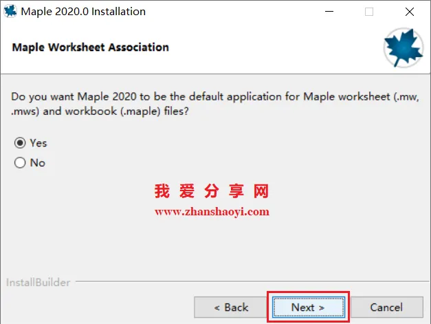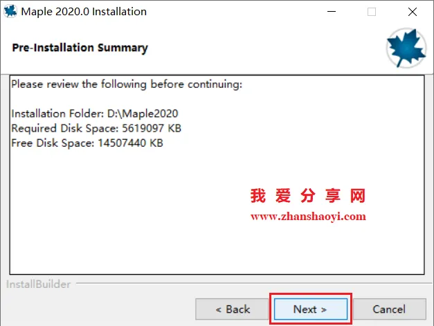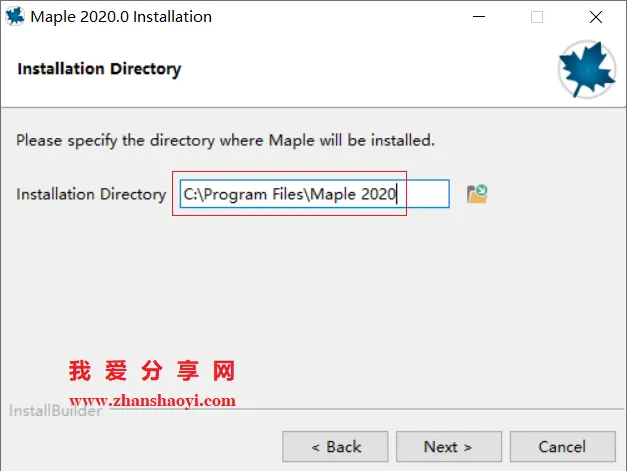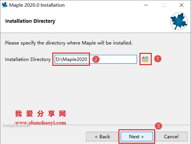 4.选择软件安装路径,默认安装在C盘,点击下图“文件夹图标”可修改软件安装路径,但需注意:安装路径文件夹名称均不能出现中文字符!小编这里将软件安装在D盘Maple2020文件夹下,然后点击【Next】