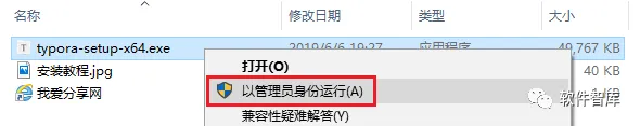 1.先根据电脑操作系统的位数下载对应Typora软件安装包到电脑磁盘里,并解压缩,然后找到typora-setup-x64.exe,鼠标右击选择【以管理员身份运行】(以64位系统为例)