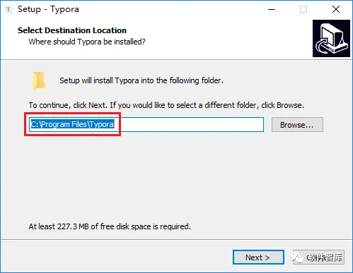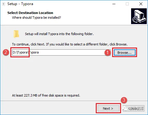 2.选择软件安装路径,默认安装在C盘,点击【Browse】可更改软件安装路径,小编这里将软件安装在D盘Typora文件夹下,然后点击【Next】