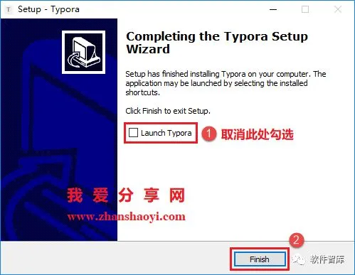 6.取消勾选“Launch Typora”,然后点击【Finish】