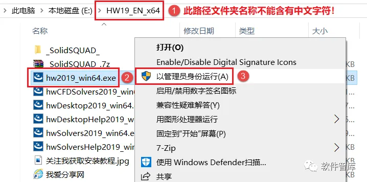 1.先使用“百度网盘客户端”下载HW19_EN_x64软件安装包到电脑磁盘根目录或英文路径文件夹下,并解压缩,然后在文件夹内找到hw2019_win64.exe,鼠标右击选择【以管理员身份运行】
