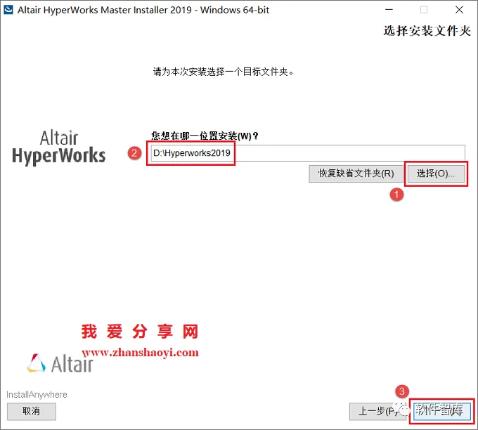 6.选择软件安装路径,默认安装在C盘,建议点击【选择】按钮可修改软件安装路径,但须注意:安装路径文件夹名称均不能出现中文字符!小编这里将软件安装在D盘Hyperworks2019文件夹下(需提前在D盘新建名为Hyperworks2019的文件夹),然后点击【下一步】