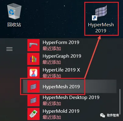 17.Win10不自动创建Hypermesh桌面图标,点击左下角“开始”按钮在右侧弹出的程序列表中找到Hypermesh2019快捷方式,鼠标左键按住不放直接拖拽至桌面生成图标,方便以后打开软件