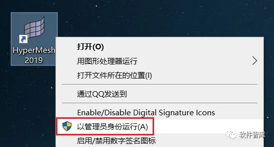 18.找到上一步生成的HyperMesh2019图标,鼠标右击选择【以管理员身份运行】