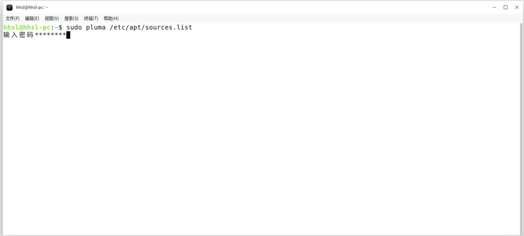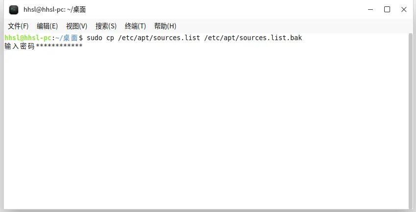 sudo cp /etc/apt/sources.list /etc/apt/sources.list.bak📌避坑提示:这里需要输入开机登录密码。注意:输入密码时屏幕上没有任何显示(盲输),这是正常的,输完直接回车即可。