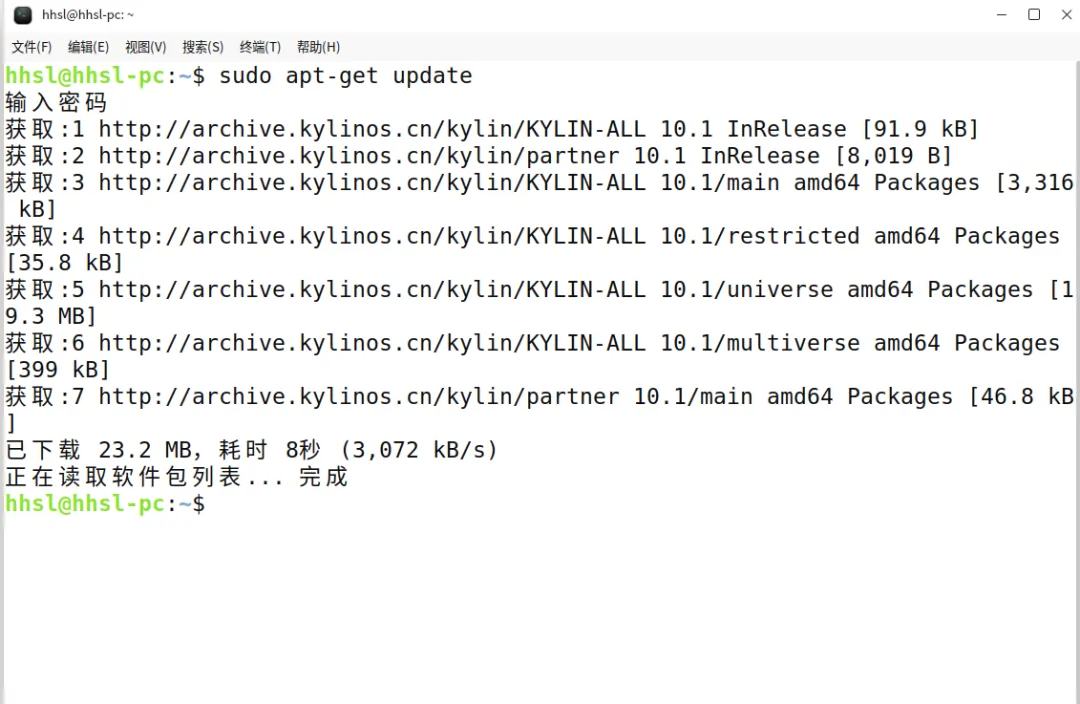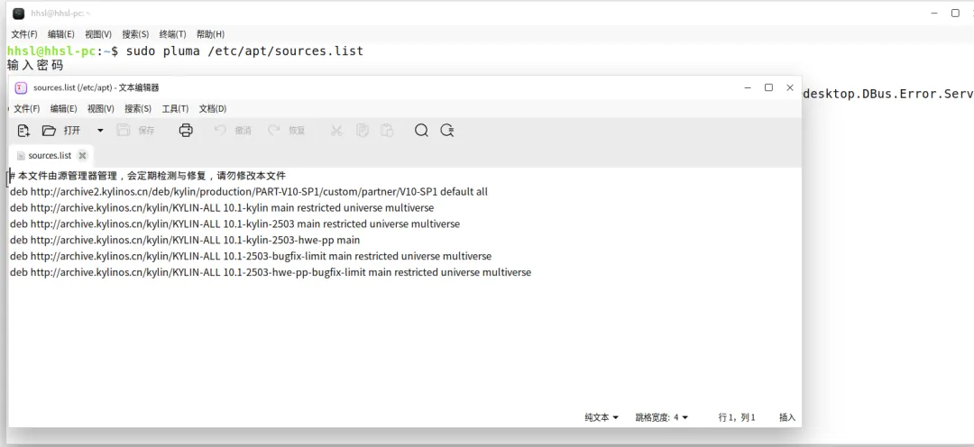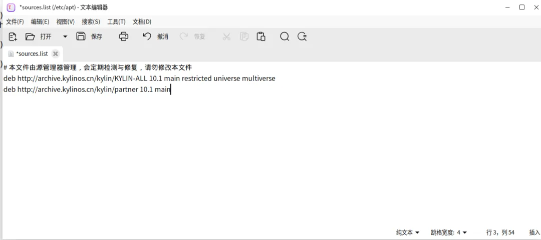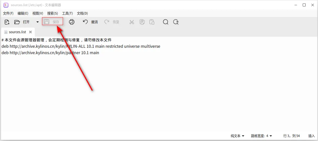 情况 A:恢复官方标准源如果你之前的源改坏了,请清空当前文件内容,复制粘贴以下官方默认配置(适用于 V10 SP1):deb http://archive.kylinos.cn/kylin/KYLIN-ALL 10.1 main restricted universe multiversedeb http://archive.kylinos.cn/kylin/partner 10.1 main情况 B:配置单位内网源将地址中的 http://archive.kylinos.cn/... 替换为单位运维提供的IP 地址即可。Step 3 | 保存退出