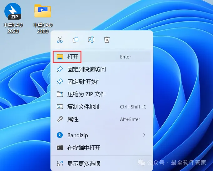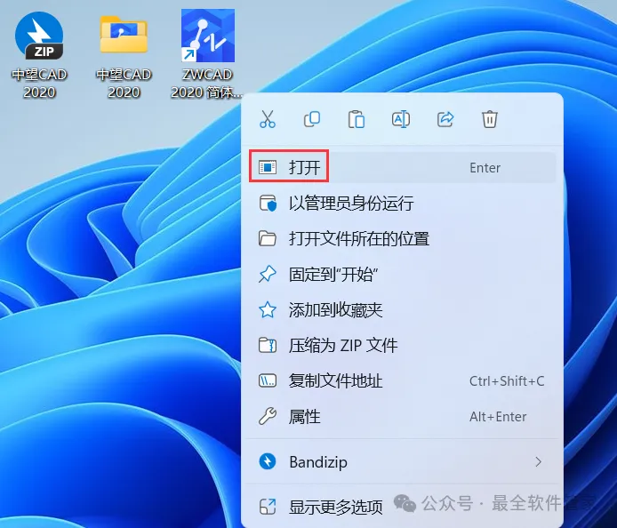 14、回到桌面,右键桌面上的【ZWCAD 2020软件图标】,点击【打开】