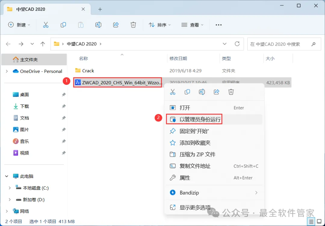 1、下载中望CAD 2020软件安装包到电脑上,右键选择【解压到中望CAD 2020\】