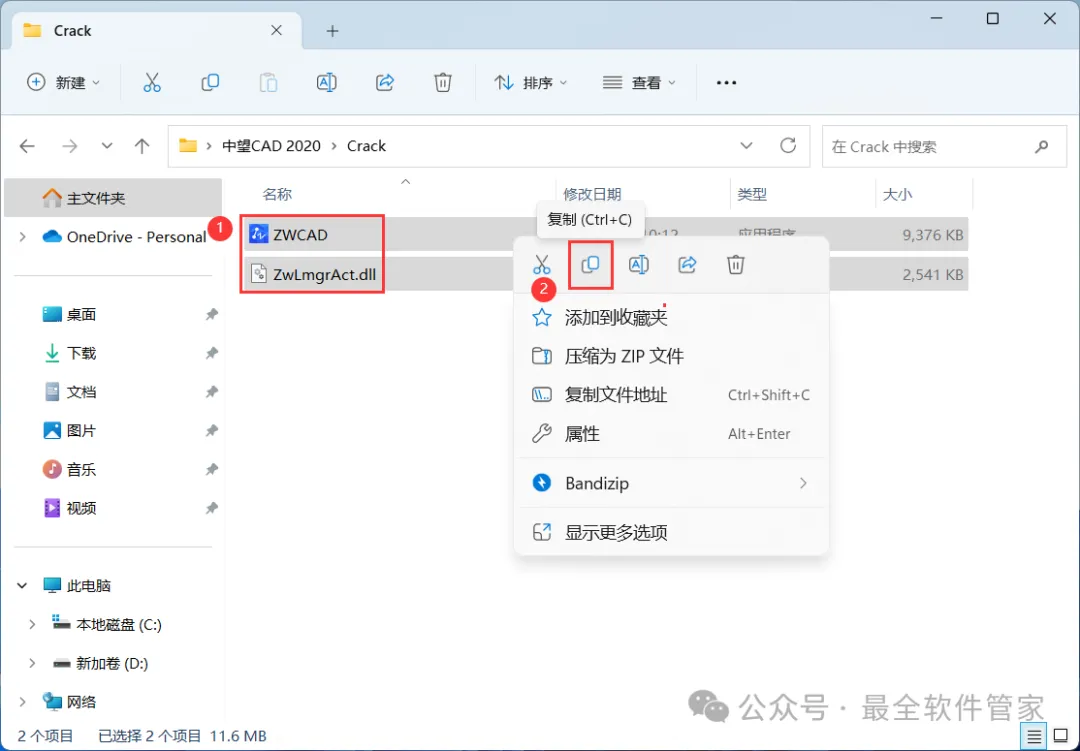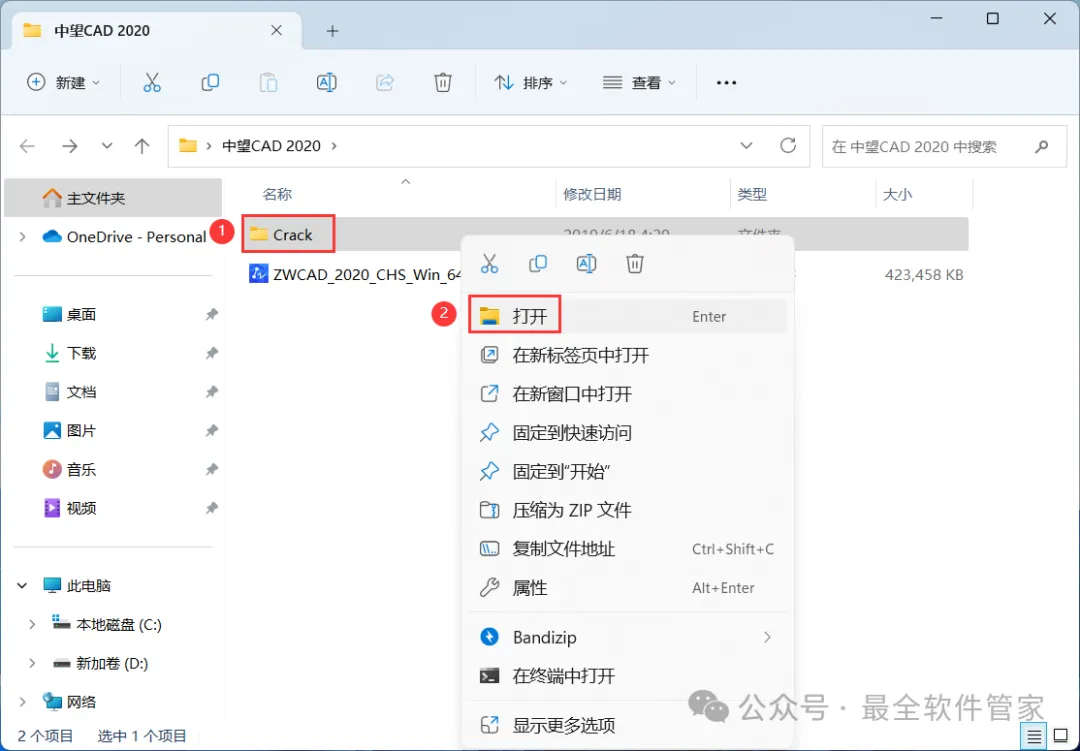 8、回到中望CAD 2020文件夹,找到【Crack】文件夹,右键【打开】它