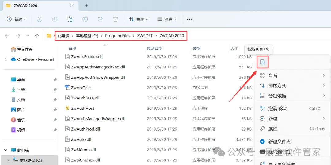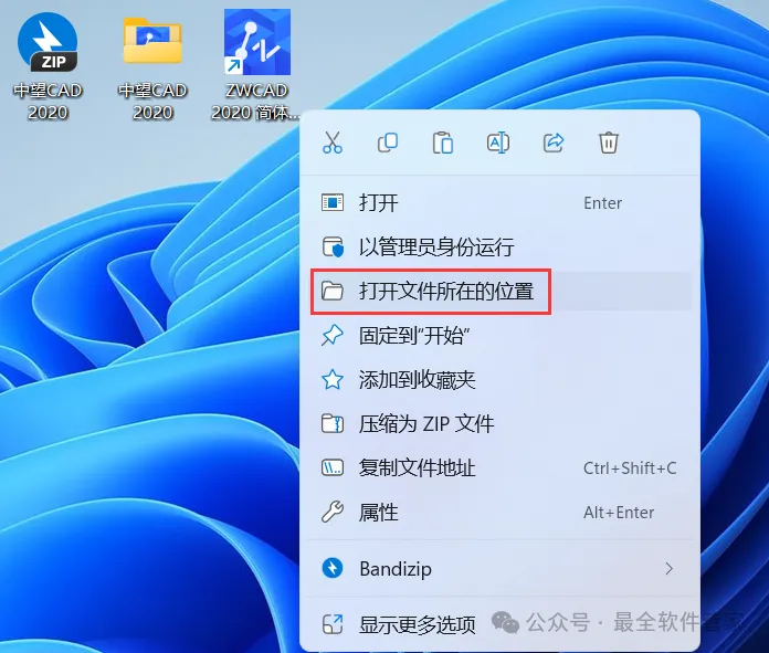 10、回到桌面,右键桌面上的【ZWCAD 2020软件图标】,点击【打开文件所在的位置】