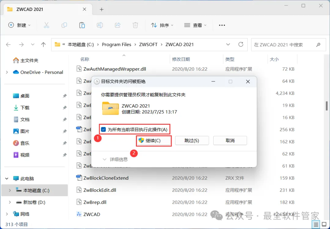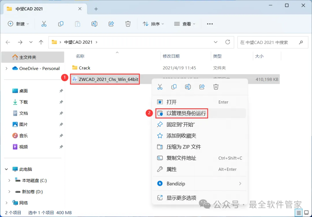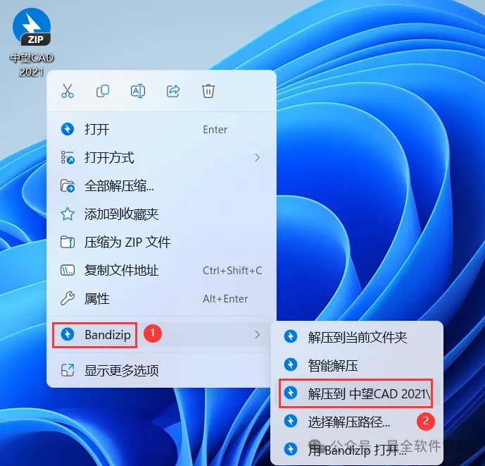 1、下载中望CAD 2021软件安装包到电脑上,右键选择【解压到中望CAD 2021\】
