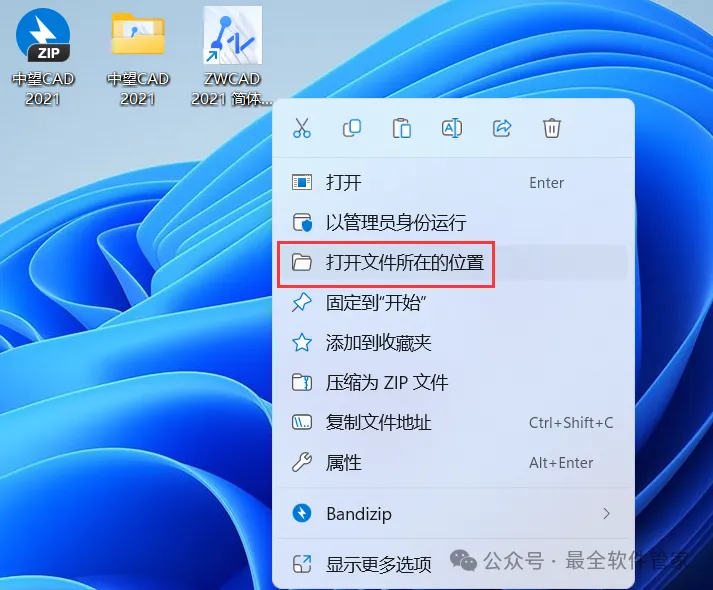 10、回到桌面,右键桌面上的【ZWCAD 2021软件图标】,点击【打开文件所在的位置】