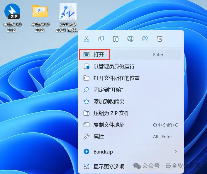 14、回到桌面,右键桌面上的【ZWCAD 2021软件图标】,点击【打开】