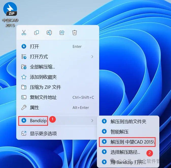 1、下载中望CAD 2015软件安装包到电脑上,右键选择【解压到中望CAD 2015\】