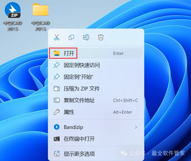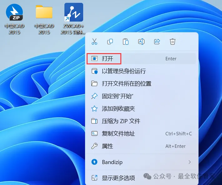 18、回到桌面,右键桌面上的【ZWCAD 2015软件图标】,点击【打开】
