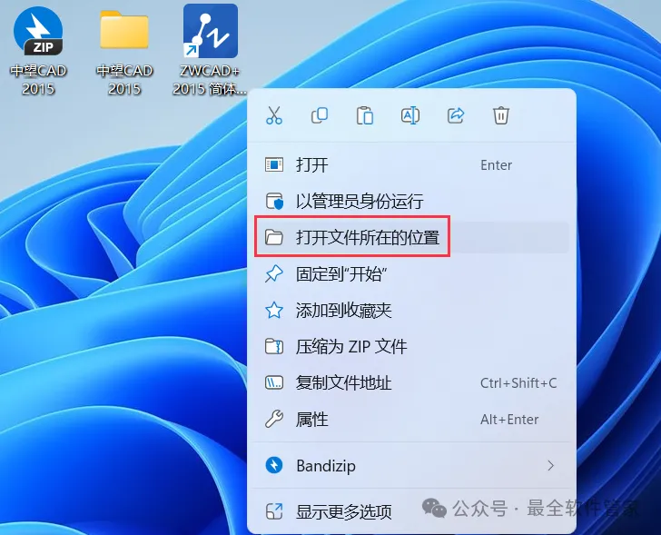 14、回到桌面,右键桌面上的【ZWCAD 2015软件图标】,点击【打开文件所在的位置】