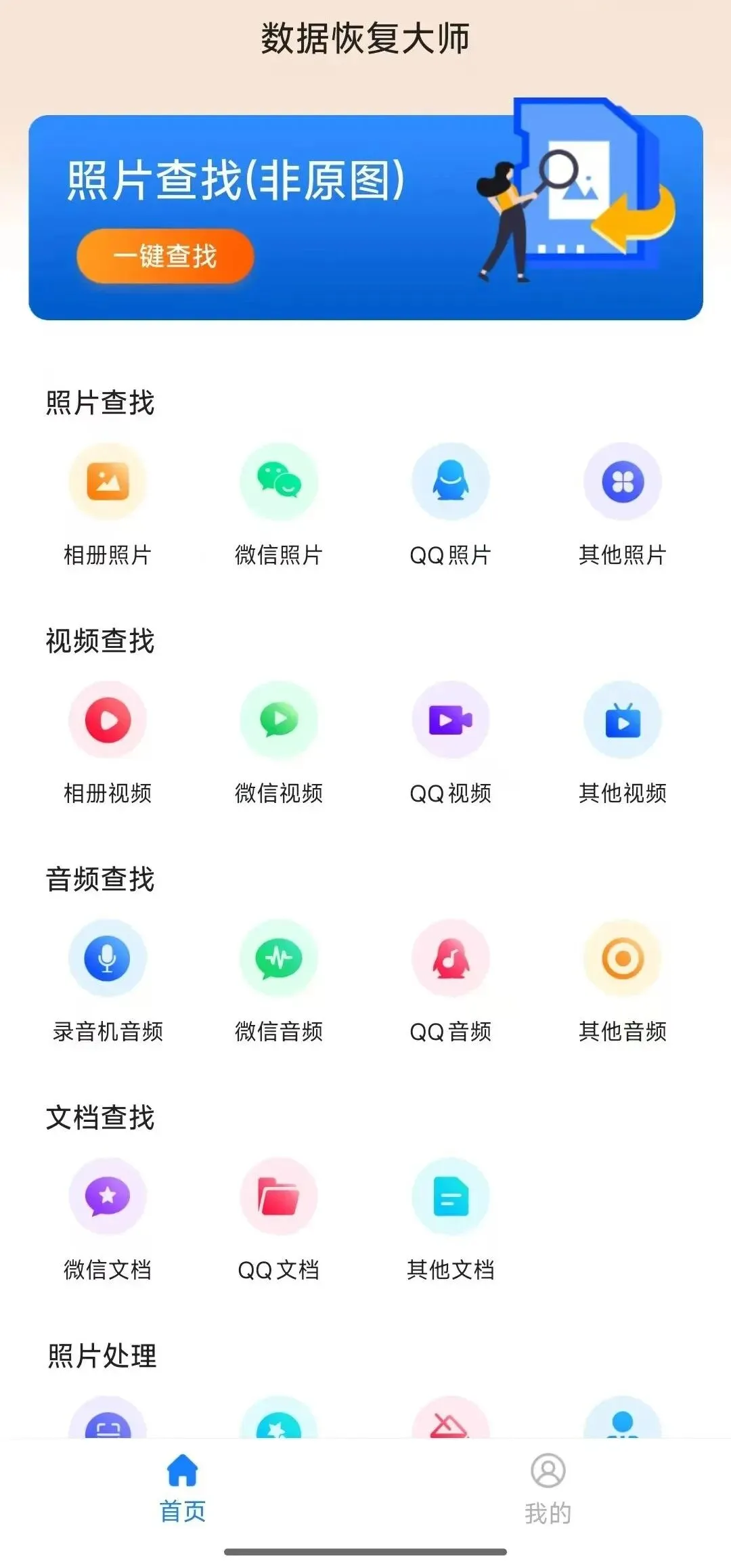 软件涵盖了照片恢复、视频查找、音频查找、文档查找、照片处理等多项功能。照片查找提示非原图。