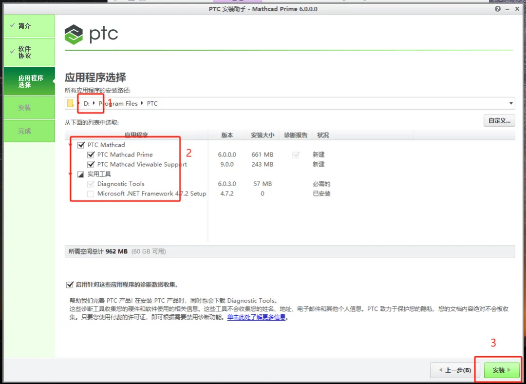 第七步:将安装位置改为D盘,安装位置中不要有中文,勾选需要安装的软件模块,然后点【安装】。