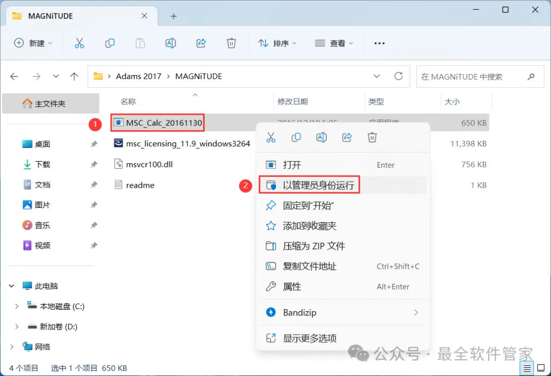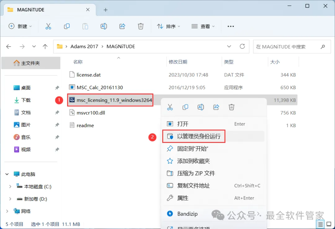 7、找到【msc_license_11.9…】应用程序,右键选择【以管理员身份运行】它