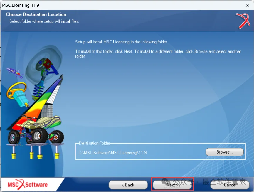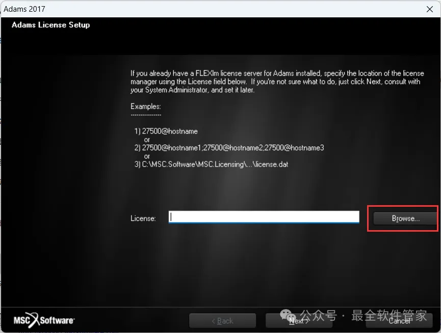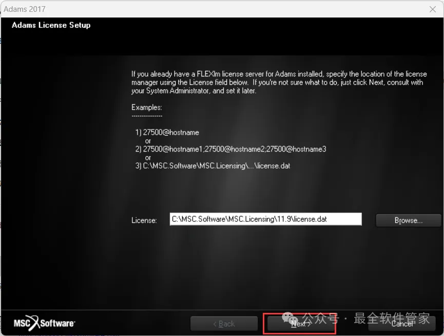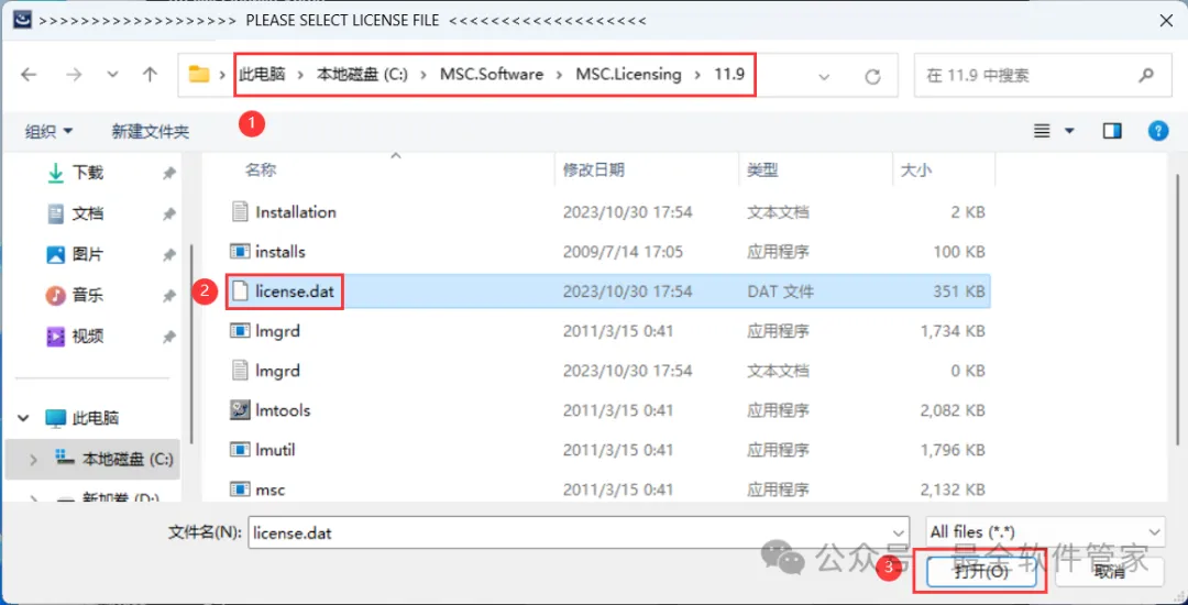 26、选择路径为:C:\MSC.Software\MSC.Licensing\11.9,找到并选中【license.dat】文件,再点击【打开】