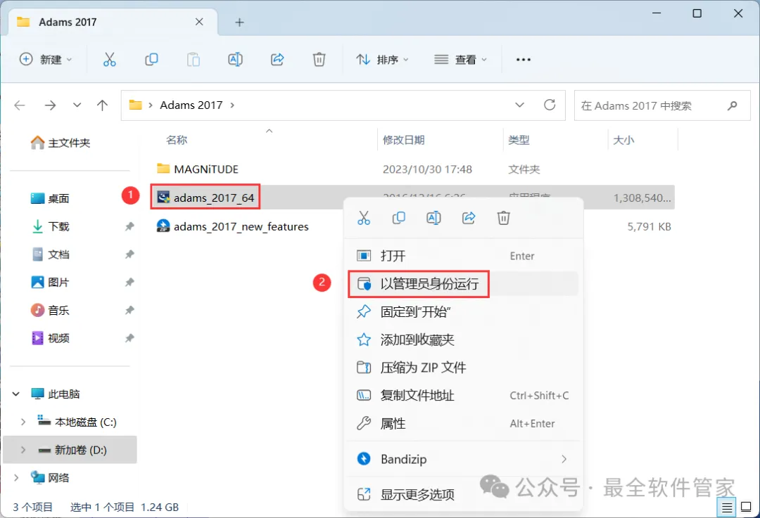 18、回到Adams 2017文件夹,找到【admas_2017】应用程序,右键选择【以管理员身份运行】它